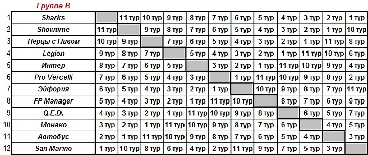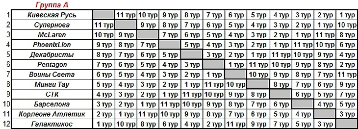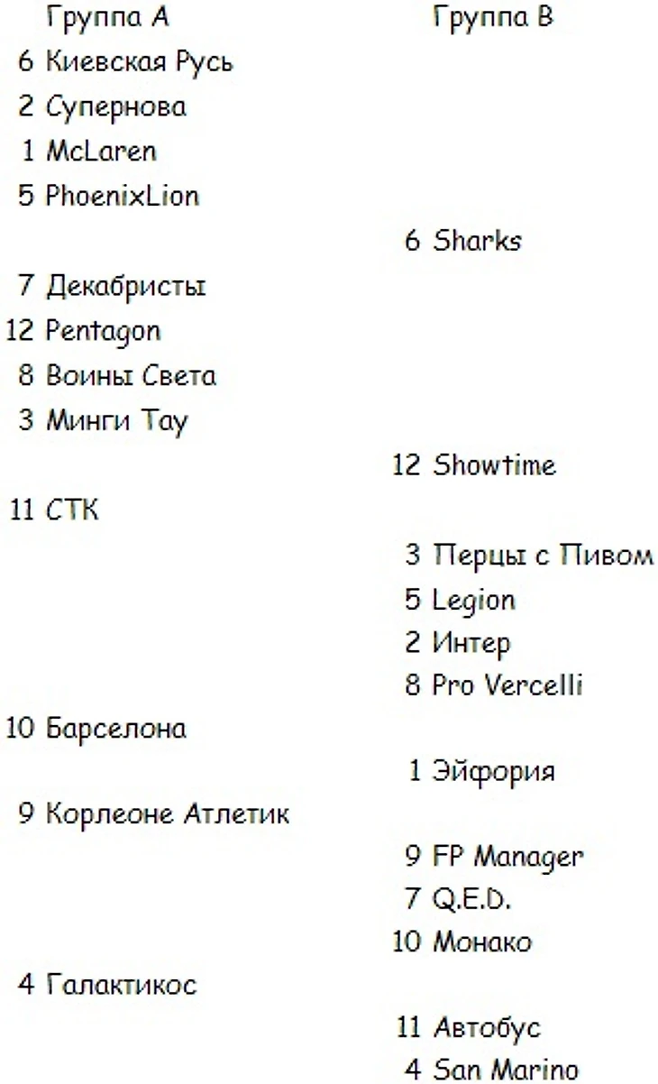 Её я провёл ещё вчера, но результаты смог донести до вас лишь сейчас, за что прошу прощения. Я в точности повторил способ Константина (Staut’a), разве что такой живописной кружки у меня не нашлось. Напомню, что команды были разделены на 12 пар по рейтингу за 4 последних сезона. Какую команду я доставал из пары первой, отправлял в группу А, её соседа – в группу B. Порядок извлечения листочков и список групп с календарём-шахматкой ниже: