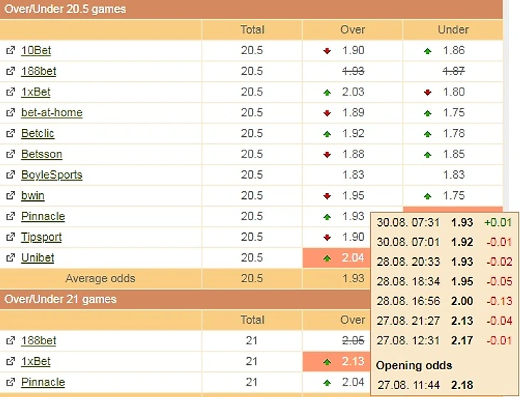 Прогноз: Тотал геймов меньше 20.5 коэффициент 1.9