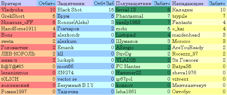 В таблице приведены следующие данные: у вратарей — это очки, которые они отняли у соперника, то есть, будем считать, сэйвы. У защитников — очки, отнятые у соперника (2 матча обороны) + набранные очки (2 матча атаки). У полузащитников и нападающих — набранные очки.