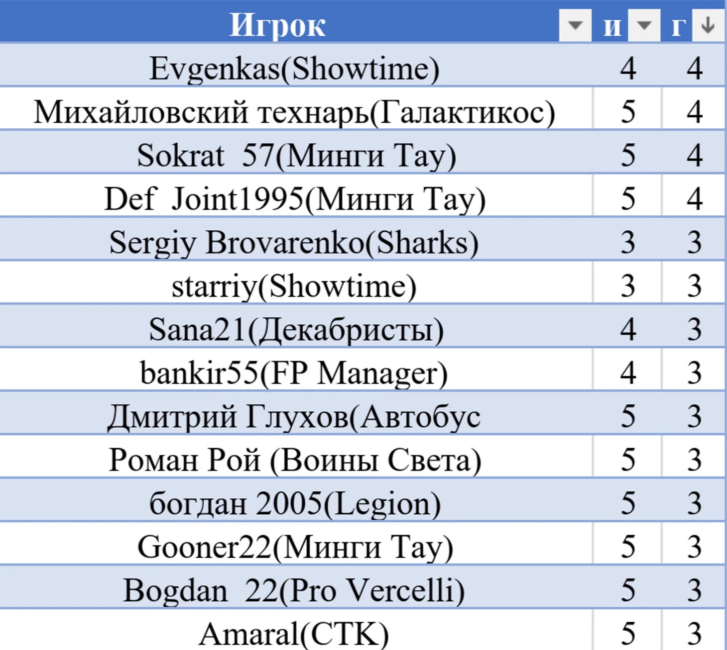 Таблица бомбардиров