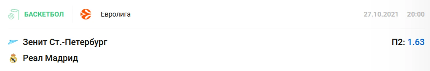 Зенит не выдержит натиска Реала. Питерцы в Евролиге обыгрывали только аутсайдеров. Реал Мадрид в то же время одержал 4 победы и проиграл только Олимпиакосу. Это одна из сильнейших команд Евролиги. Ставим на победу Реала.