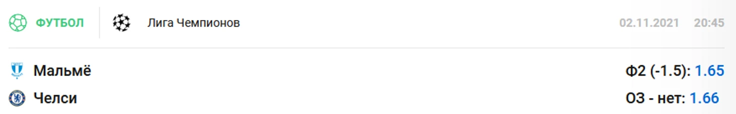 Лондонский Челси является действующим обладателем трофея Лиги Чемпионов и всеми силами старается подтвердить свой статус. В первом круге группового этапа лондонцы минимально переиграли Зенит и также минимально уступили Ювентусу. Но, в матче против Мальмё команда Томаса Тухеля добыла уверенную победу со счетом 4:0. В предстоящей встрече гости тоже способны на разгром.
