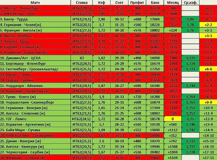 Приветствую, Дорогие друзья и любители ставок!!!! Последние дни получились удачными, в отличии от начала месяца. Удалось не только ликвидировать сложившийся минус, но и выйти в зеленую зону. Профит на данный момент не слишком большой, но последние ставки внушают оптимизм, а до окончания месяца еще достаточно времени. В последних 12-ти ставках было только 2 минуса. На 09.12. было сделано 28 ставок, +17 - 11. Проход - 60,71%. Средний кэф.-1,728. +1104 или 5,94%. Банк - 19682. Очередной лайв начну сегодня в 17-30. Более оперативно получить инфу о ставках можно в Телеге.