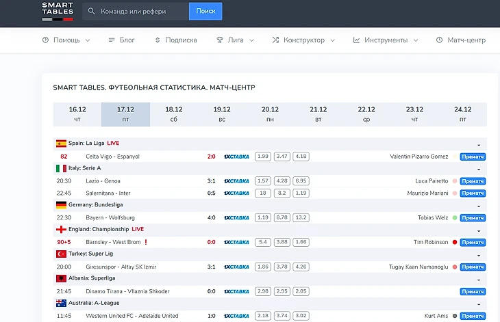Данный сайт имеет расширенную статистику по арбитрам футбольных матчей, таким показателям, как офсайды, удары в створ, желтые карточки и многое другое. Подобные ставки не числятся в основных линиях букмекеров, что и является сладким кусочком для любого игрока. Для анализа используются только статистика и тренды по конкретным чемпионатам, командам. Из плюсов можно отметить огромное количество чемпионатов для составления своего прогноза.