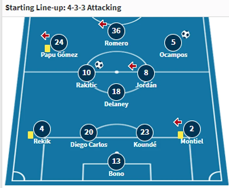 Sevilla: Bounou; Augustinsson, Kounde, Carlos, Rekik; Jordan, Fernando, Rakitic; Ocampos, Mir, Gomez