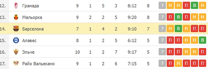 Одна единственная победа в 7 матчах, отрицательная разница забитых и пропущенных. Это все Барса, конечно можно уповать на всего 2 поражения, они смогли выстоять против таких монстров как Сельта, Осасуна, Кадис)) проиграв и Атлетико и Райо, оба случая на классе! Х*й пойми как обыграв Вильяреал...но блин, это Севилья, это не Вильяреал!