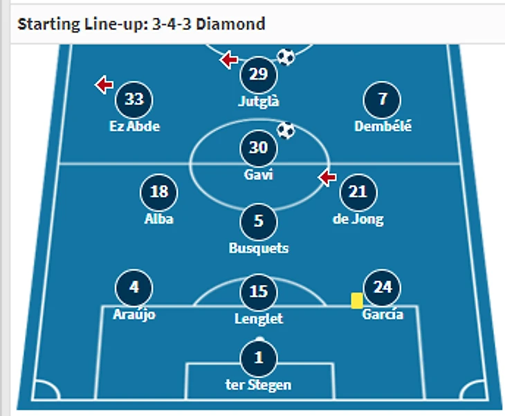 Barcelona: Ter Stegen; Araujo, Garcia, Lenglet; Busquets, De Jong, Alba, Gavi; Coutinho, Gonzalez, Ezzalzouli
