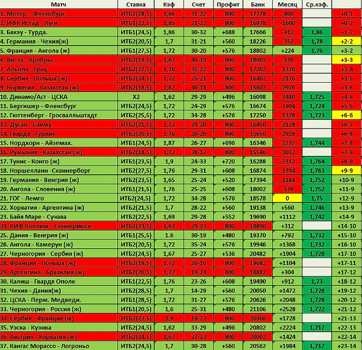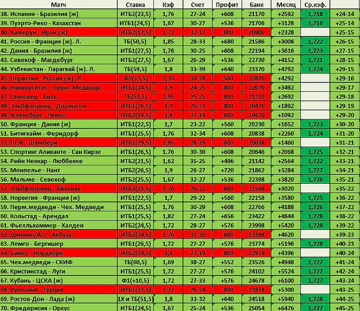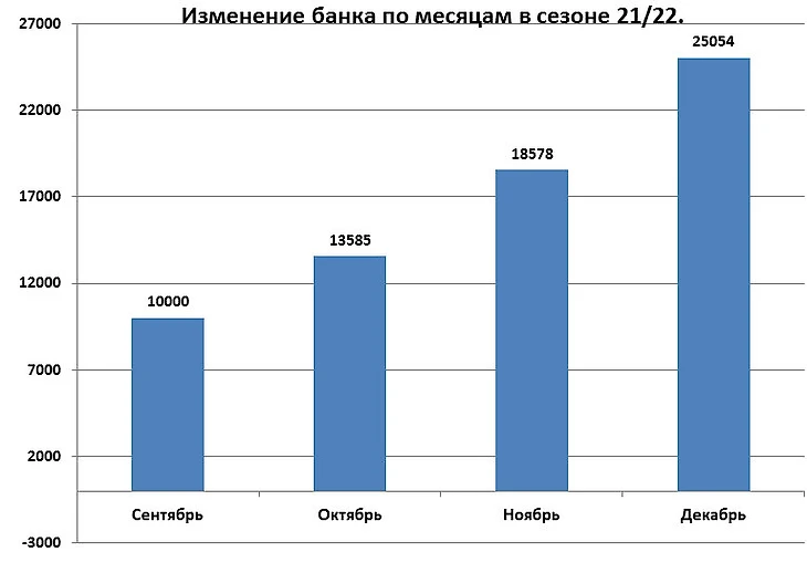Октябрь - 28ст, +20 -8 (71,43%). +3585 (35,85%) или 7,17 флэта. ROI=25,61. Ср. кэф.-1,759.Ставки по 500. Банк - 13585. Ноябрь - 46ст, +31 -15 (67,39%). +4993 (+36,75%) или +7,68 флэта. ROI=16,7. Ср.кэф-1,732. Ставки по 650. Банк-18758. Декабрь - 70ст, +45 -25 (64,29%). +6476 (+34,86%) или +8,09 флэта. ROI=11,56. Ср.кэф-1,727. Ставки по 800. Банк -25054. Сезон 21/22 - 144ст, +96 -48 (66,67%). +15054 (150,54%) или 22,94 флэта. ROI=15,07. Ср. кэф.-1,739. Банк - 25054.