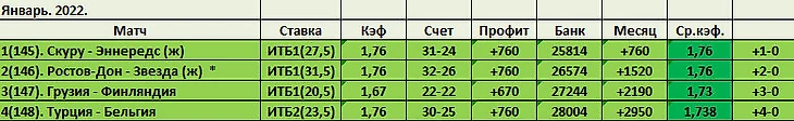 Приветствую, Дорогие Друзья и любители ставок!!!! Первый месяц нового года начался удачно. Из четырех ставок зашли все четыре со средним кэфом-1.738. Профит +2950 (+11,77%) или 2,95 флэта. Банк -28004. С учетом декабря победная серия составляет 6 ставок. Так, что теперь нужно быть аккуратней. Если кто-то ставит вместе со мной, то не рекомендую ставить более одного флэта. Мир спорта в очередной раз накрывает ковид. Многие матчи отменяются, и гандбол не является исключением. Буду стараться найти самое надежное.