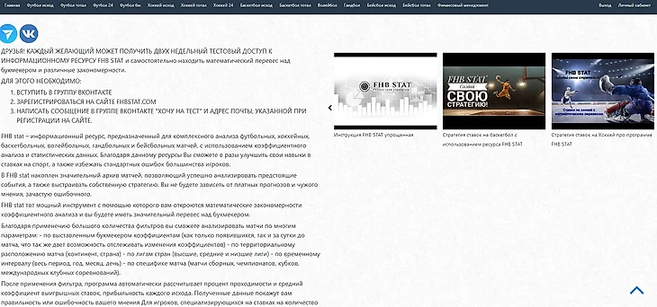FHB Stat не дает готовых прогнозов, а является базой данных различных спортивных событий по 6 видам спорта (футбол, хоккей, волейбол, гандбол, бейсбол, баскетбол). На сайте представлены матчи и коэффициенты, которые предлагает букмекер на каждое игровое событие.