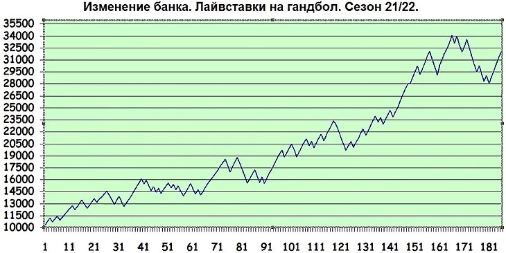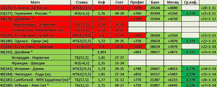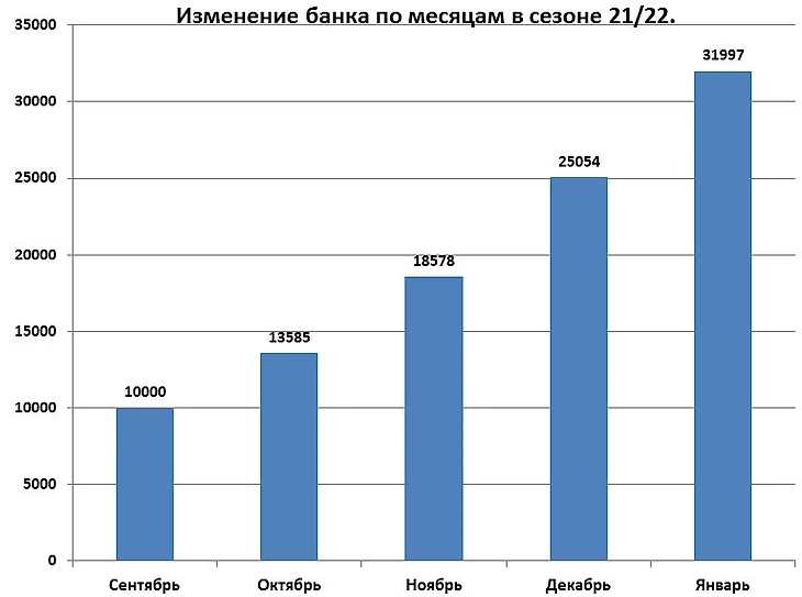 Октябрь - 28ст, +20 -8 (71,43%). +3585 (35,85%) или 7,17 флэта. ROI=25,61. Ср. кэф.-1,759.Ставки по 500. Банк - 13585. Ноябрь - 46ст, +31 -15 (67,39%). +4993 (+36,75%) или +7,68 флэта. ROI=16,7. Ср.кэф-1,732. Ставки по 650. Банк-18758. Декабрь - 70ст, +45 -25 (64,29%). +6476 (+34,86%) или +8,09 флэта. ROI=11,56. Ср.кэф-1,727. Ставки по 800. Банк -25054. Сезон 21/22 - 186ст, +123 =1 - 62 (66,13%). +21997 (219,97%) или 29,88 флэта. ROI=15,5. Ср. кэф.-1,749. Банк - 31997. В феврале все ставки будут по 1500. Желаю всем удачных ставок и профита!!!! Более оперативно получить инфу по ставкам можно в Телеге, где она публикуется раньше всего.