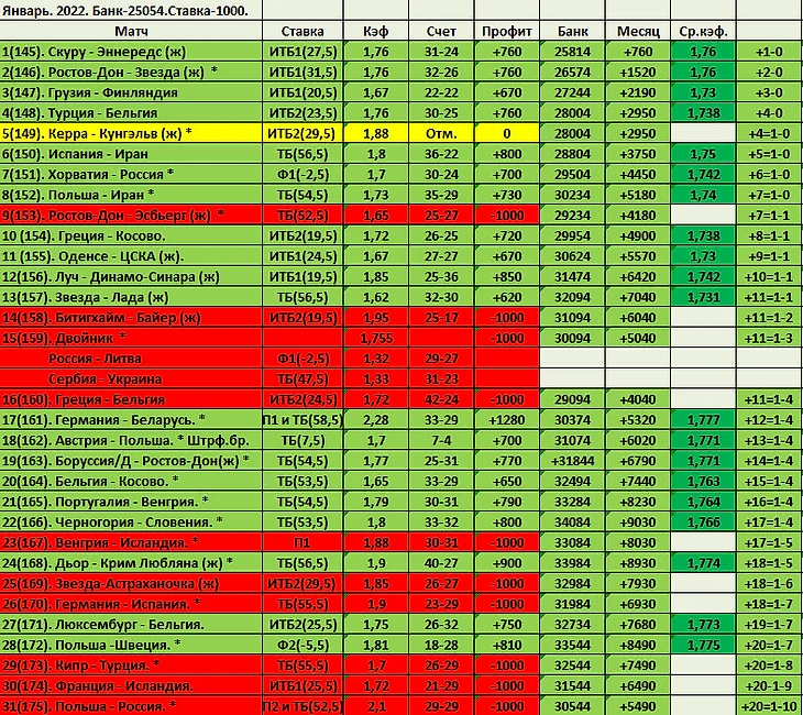 Приветствую, Дорогие Друзья и любители ставок!!!! Вот пролетел и еще один ставочный месяц. Сложился он вполне удачно, даже не смотря на ряд неудачных ставок во второй половине месяца. В очередной раз получил подтверждение тому. что надо не отходить от выбранных принципов отбора событий. В отчетном месяце было три таких случая, при выборе ставок в лайве, и все три завершились поражением. Ну, и еще один из залогов удачной игры - это соблюдение финансовой стратегии. Январь 2022. 42ст., +27 =1 -14. Проход - 64,29%. Средний кэф зашедших ставок - 1,776. Профит: +6943 (+27,71%) или +6,94 флэта. Банк - 31997 ROI=16,53%.