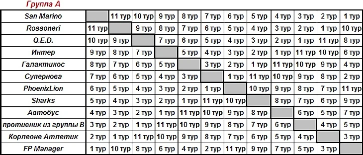Доставая бумажку из корзины, я смотрел, в какую по счёту пару входит данная команда. Второй коллектив из данной пары автоматически попадал в другую группу, но ждал своего жребия, чтобы определить своё положение в списке своей группы. Результаты жеребьёвки с шахматками групп приведены ниже.