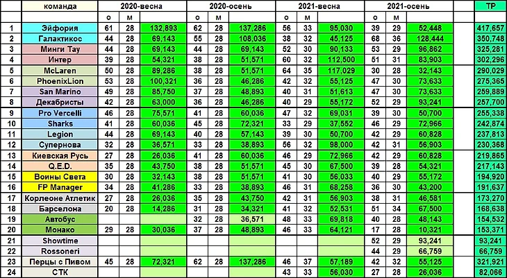 Примечания: С "Барселоны" и "Автобуса" снято по 9,000 рейтинга (для первых в совокупности с тремя штрафными очками в Апертуре за грубое несоответствие заявленных ников с подтверждавшими контракты, для вторых – отложенный до конца прошлого сезона штраф за отсутствие 7 подтверждённых контрактов при небольшой просрочке). Для "Sharks" и "Галактикос" учтён матч за Суперкубок.