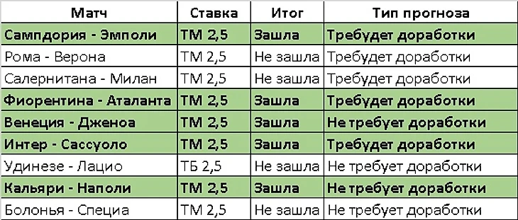 Итак, ставки на выходные были следующими. Я так же добавил тип прогноза, где нужно дорабатывать модель, а где нет(как я считаю на момент публикации).