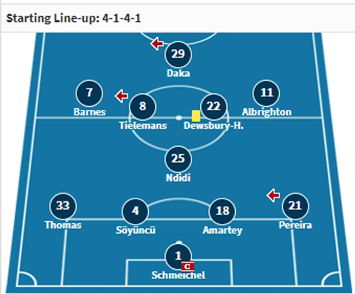 Leicester City: Schmeichel; Albrighton, Amartey, Soyuncu, Thomas; Tielemans, Ndidi; Lookman, Maddison, Barnes; Vardy
