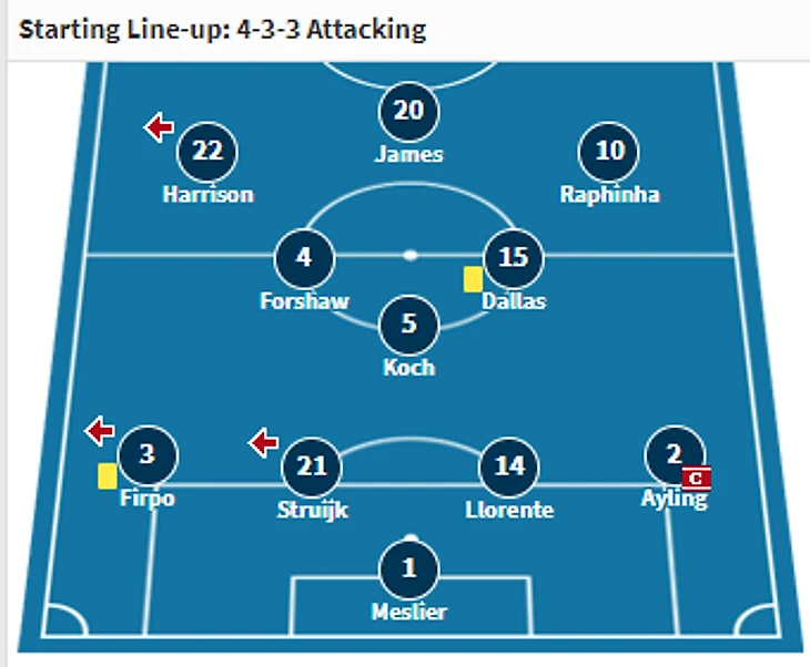Новый тренер Лидса вряд ли что то поменяет в первом матче, "Павлины" сыграют в своей схеме, но какое у них будет ментальное состояние это вопрос... все любили Бьелсу и его отставка может сильно ударить психологически по команде, которая в затяжном пике. Касаемо состава, все еще вне игры Бэмфорд, это значит что на острие увидим Джеймса. номинально вингера и не умеющего играть в завершении, на флангах понятно Харрисон и Рафинья. В центре те же люди Клих, Форшоу и Даллас, последние двое не уровня Премьер Лиги, им нехер здесь делать. в защите Фирпо и Эйлинг на флангах и в центре конченый привоз Кох и Ллоренте.