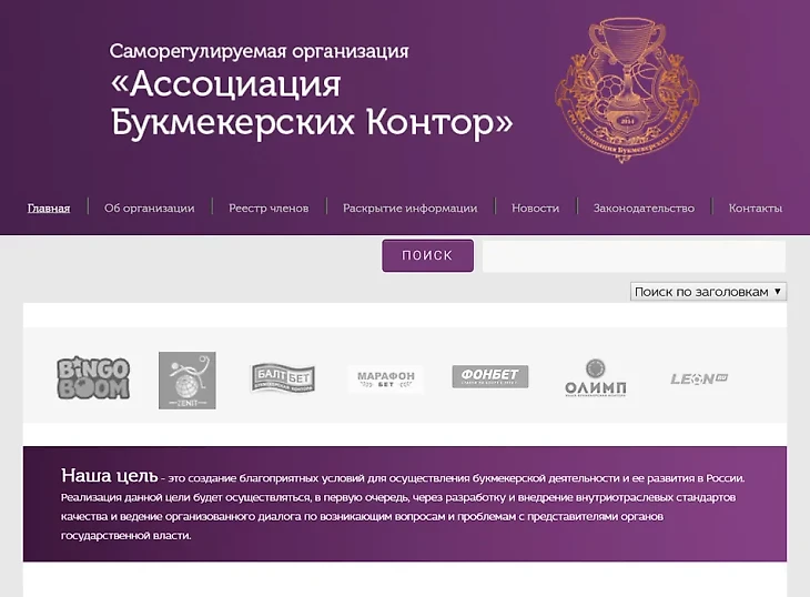 В «Ассоциацию букмекерских контор» входят: «Бинго бум», «Зенит», «Балтбет», «Марафон», «Фонбет», «Олимп» и «Леон»