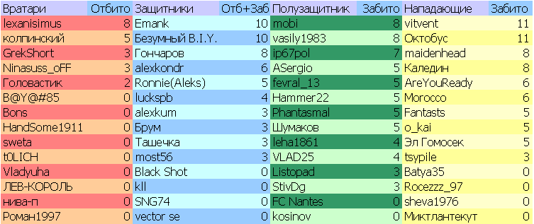 В таблице приведены следующие данные: у вратарей — это очки, которые они отняли у соперника, то есть, будем считать, сэйвы. У защитников — очки, отнятые у соперника (2 матча обороны) + набранные очки (2 матча атаки). У полузащитников и нападающих — набранные очки.