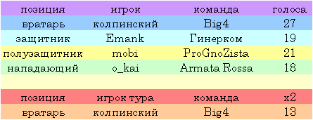 Вначале привожу таблицу с результатами голосования по предыдущему, двадцать пятому туру. В этот раз приняло участие 27 респондентов. И навыбирали они следующих игроков: