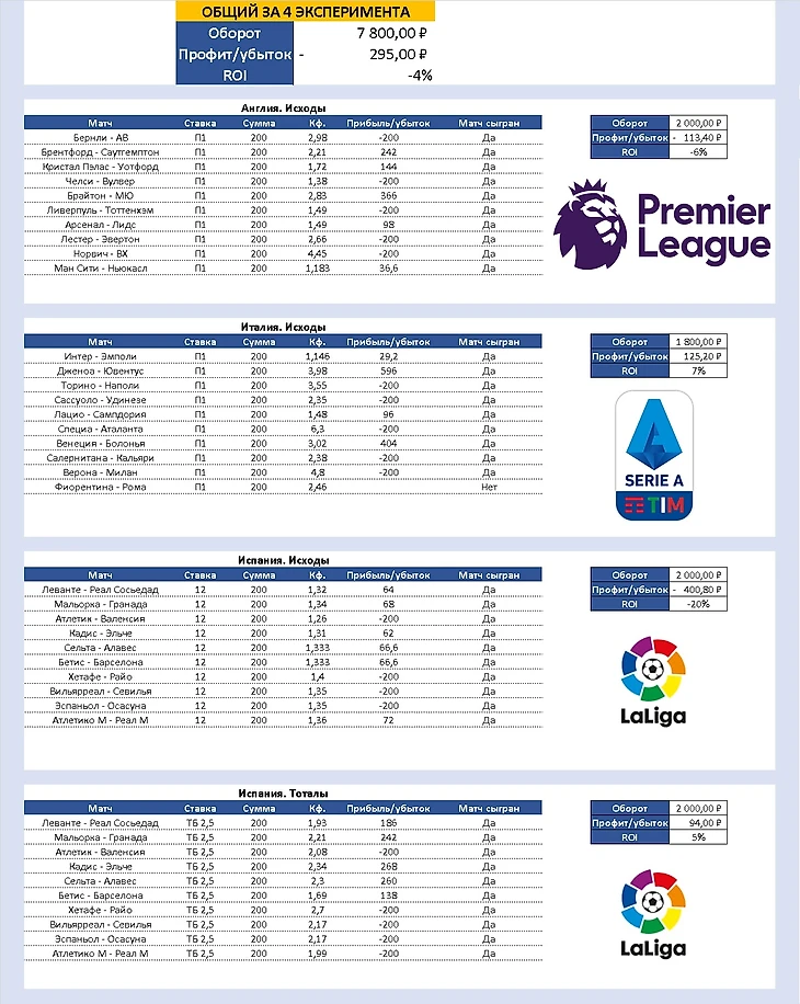 Если одной строкой по итогам ставок, то вчера запустил LIVE ставки, дал одну ставку - не будет Х в матче Специя - Аталанта за 1,76. ТМ сыграл в матче Локомотива. Не скажу что было очень очевидно что будет ТМ, но после высоких тоталов у двух команд были большие шансы на ТМ. В Испании вообще был треш, воскресные матчи прошлой недели и текущей повторились по исходам. Первые 3 матча Х, четвертый матч без Х. Ну конечно же я взял эту ставку. Ну и итоги эксперимента... Общий итог - минус. Но отдельно по чемпионатам есть интересные результаты. Англия - убыток -113 рублей. Италия - прибыль +125 рублей. Испания(12) - убыток 400 рублей. Испания(тоталы) - прибыль 94 рубля. В итоге подвела сильно Испания на ставку, что не будет Х. Без Испании, общий профит был бы в районе 2% от оборота...очень мало, но плюс.