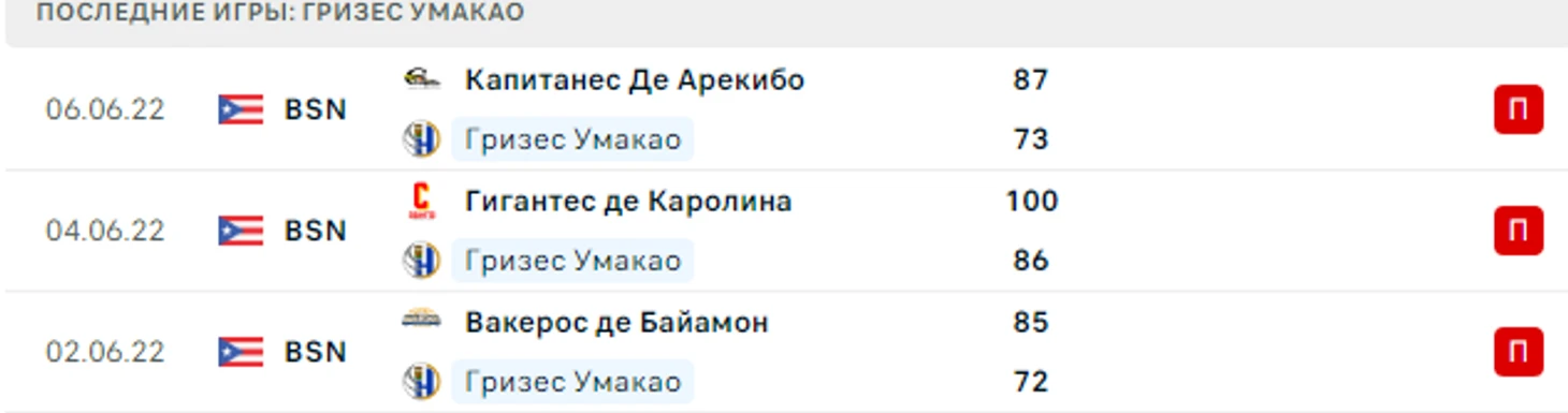Если дома они набирают 94 очка в атаке, то в гостях всего 81.6, а в защите 83.8 очков. Что весьма мало и надеяться что вдруг днище из Умакао наберет под 90 в игре с лидером, я бы не стал. Тем более уже дважды Байамон их ломал, правда дома. Можно уповать что Гризес дома набирают аж 86 очков, и могут пободаться, но шансы минимальны, уж слишком много потерь у хозяев.
