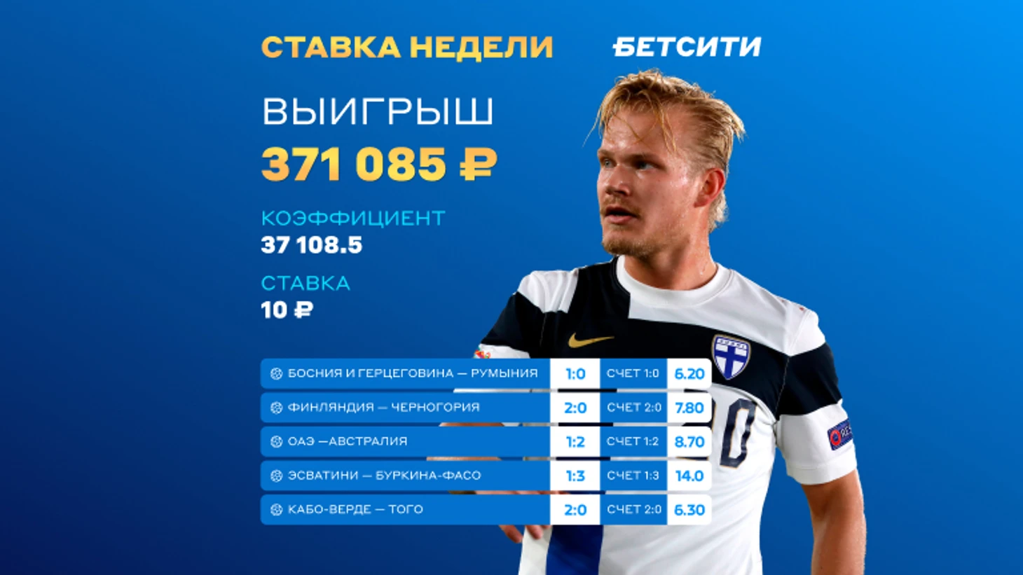 Счастливчик собрал в один экспресс пять точных счетов на матчи сборных и угадал каждый из них. Просто невероятно! Поставил он всего 10 рублей, но выиграл более 370 000 рублей!
