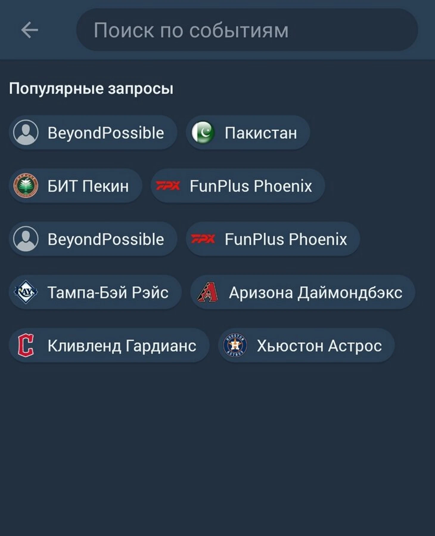 2. Поиск по событиям. Заметно сокращает время поиска нужного матча: заходите в поиск, вводите название команды или чемпионата и вуаля – перед вами линия на него. И не нужно тратить несколько кликов, чтобы добраться до условного чемпионата Беларуси по хоккею.
