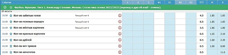 На пять голов Головина дают 1.85, то есть 50% без учета маржи букмекера. Тотал 4,5 Александр пробил лишь раз в Лиге 1, еще в трех сезонах забивал по три мяча – цифры вполне адекватные;