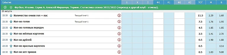 А вот пять голевых за 1.85 (50% вероятности) – вполне себе трезвая оценка с точки зрения статистики: в прошлом сезоне в составе «Аталанты» Миранчук записал на свой счет четыре ассиста в 19 играх.