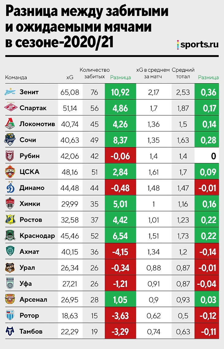 Чтобы не делать выводов лишь по одному сыгранному сезону, обратимся к РПЛ-2020/21.