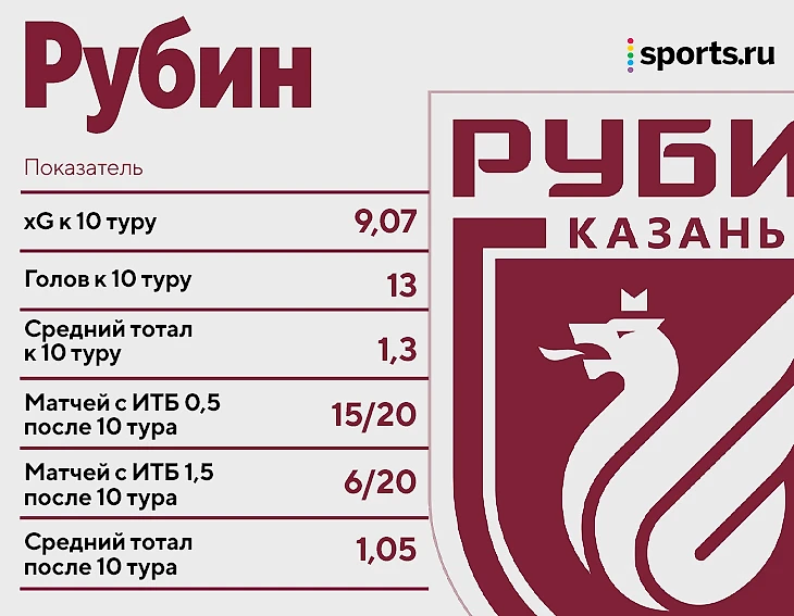 Возьмем пару прошлогодних примеров. «Рубин», например, в первых десяти турах забил 13 мячей при суммарном xG в 9,07. Средний тотал клуба – солидные 1,3 мяча за игру.