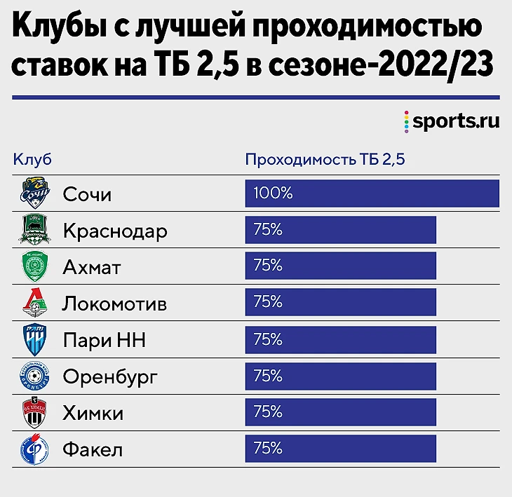 На верхушке рейтинга проходимости ставок на ТБ неожиданного всего три топовых (по меркам РПЛ, конечно же) клуба: кроме «Сочи» больше 70% показывают «Краснодар» (привет Сперцяну) и «Локомотив», который пока чуть больше пропускает, чем забивает.