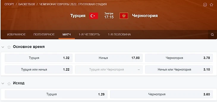 Исход. Самый распространенный рынок: игроку нужно угадать, как завершится матч. В подавляющем большинстве баскетбольных матчей ничья невозможна, поэтому БК принимают пари и на исход матча в основное время, и с учетом овертайма. На ничью в основное время можно поставить отдельно – коэффициенты здесь традиционно высокие (от 10.00 и выше). Также предлагается двойной исход на основное время. Ниже приведена роспись матча баскетбольного ЧЕ Турция – Черногория. На победу турков в основное время предлагается коэффициент 1.32, на черногорцев – 3.78, на ничью – 17.00. Здесь же есть варианты на Турцию с ничьей или Черногорию с ничьей в основное время и на победу команд в матче с ОТ (обозначен как «Исход»).