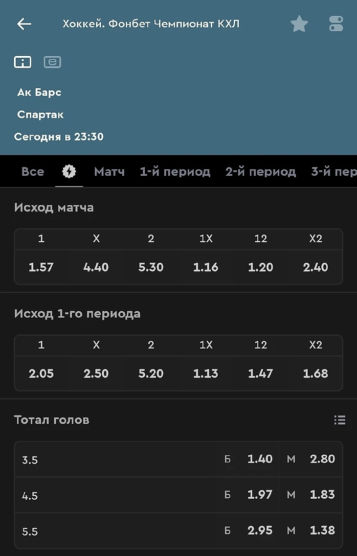 Для закрепления обратимся к конкретному примеру: возьмем линию «Фонбета» на предстоящий матч КХЛ «Ак Барс» – «Спартак». Рассчитаем математическое ожидание от ставки на ТМ 4,5 в игре при ставке в 1000 рублей: (1000*1.83 – 1000)*52% – 1000*48% = – 48,4. У исхода отрицательное математическое ожидание, а значит на дистанции подобные пари непременно приведут игрока в минус.