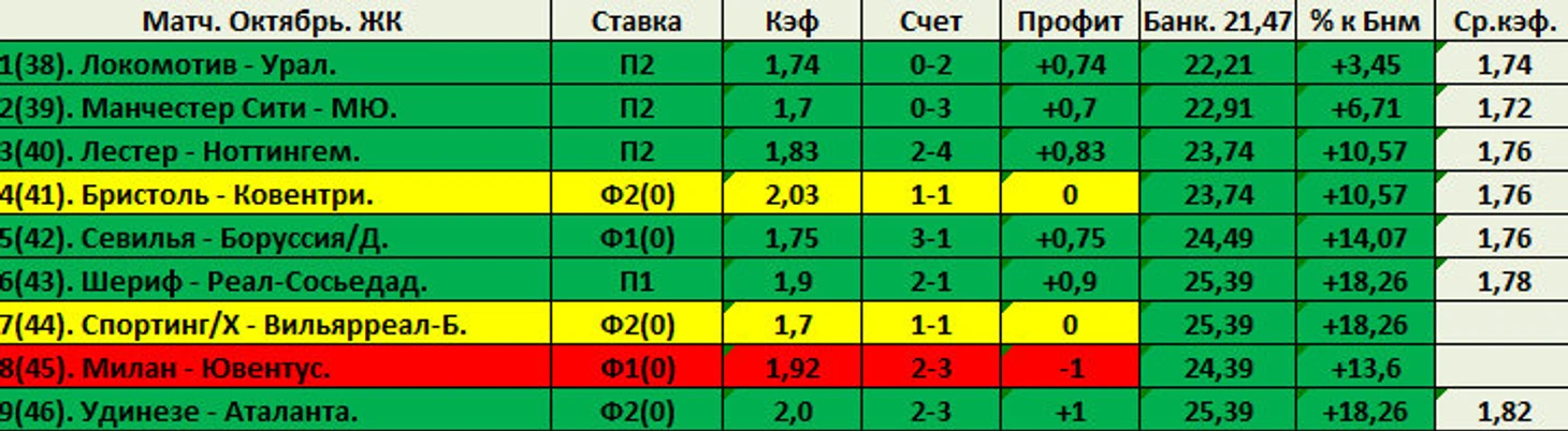 Приветствую, Дорогие друзья и любители ставок!!!! Первая треть месяца пролетела не заметно. Результаты за этот период положительные, что не может не радовать)) За это время было сделано 9 ставок, из которых +6 зашли, по двум ставкам был возврат, и одна ставка проиграла. Проигрыш можно признать случайным - футболисты "Милана" и "Ювентуса" на 4-ой компенсированной минуте организовали потасовку, и рефери сразу же дал 3 горчичника. И, после раздачи карточек Орсато дал финальный свисток, зафиксировавший победу туринцев по горчичникам. Проход составил 66,67%. За эти дни банк увеличился на 3,92 флэта или +18,26%. Средний кэф зашедших ставок - 1,82.
