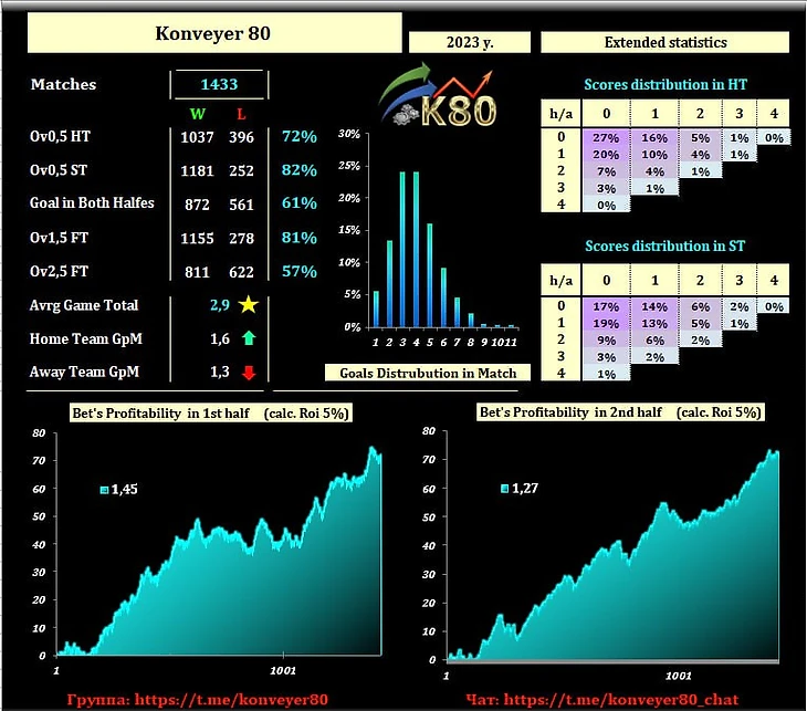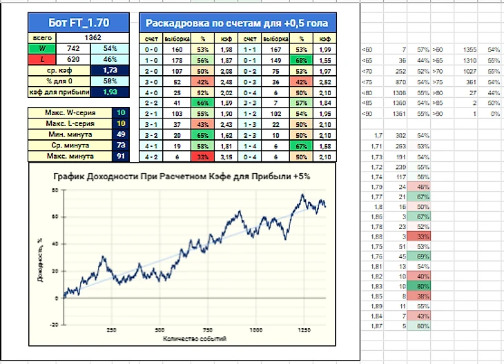 Были просадки за месяц по первому тайму, в моментах ощутимы, но на дистанции достаточно быстро нивелируемы. Они как часть процесса неотъемлемы. Верно говорит Володя NLO: «Главное на Вин стрике больше заработать, а на Луз стрике меньше потерять!» Для этого, как показала практика лет, не стоит увеличивать флет, после победной серии. Потому что все идет волнами. А волны кстати, теперь можно отслеживать по каждому боту индивидуально, онлайн. По результатам каждого матча Сразу! Наши мастера статистики и воплощения ее в визуализацию, поработали на славу. Для оптимизации этого инструмента и удобства всех участников клуба. Расскажем о нем подробней дальше.  В последние несколько дней произошла не большая коррекция в низ, ожидаем восходящий тренд к выходным.