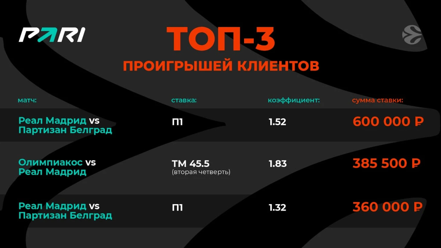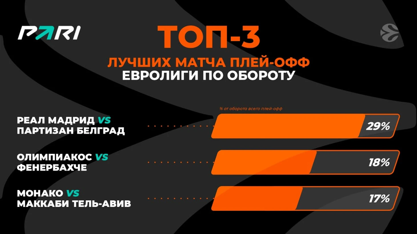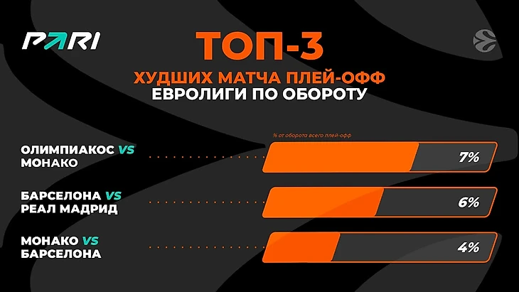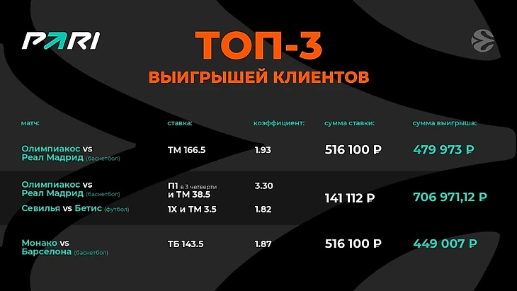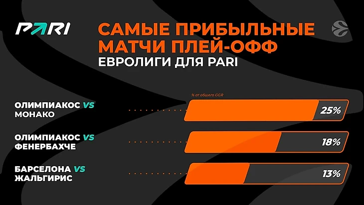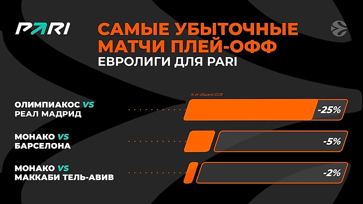 Самым прибыльным событием плей-офф Евролиги для PARI стала полуфинальная битва между «Олимпиакосом» и «Монако», завершившаяся победой греков со счетом 76:62. Этот матч примечателен тем, что первые две четверти остались за монегасками. Но в третьей четверти совершилось невозможное: баскетболисты греческой команды катком прошлись по сопернику, позволив ему заработать за этот отрезок лишь два очка. А сами набрали 27. После этого монегаски пришли в себя и попытались переломить ход игры, но последняя четверть тоже осталась за «Олимпиакосом».