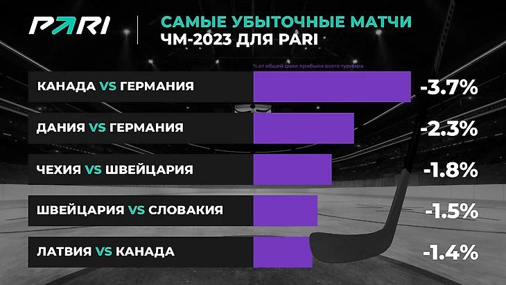 Если сравнивать этот мундиаль с прошлогодним, то нынешний турнир превзошел ЧМ-2022 по хоккею как по обороту, так и по прибыли. Прирост оборота составил почти 54%, а прибыли PARI — около 785%. Но при этом финал 2022 года, в отличие от 2023 года, был прибыльным для компании. В сравнении с финалом ЧМ-2022 убыток по решающему матчу ЧМ-2023 составил 173%.