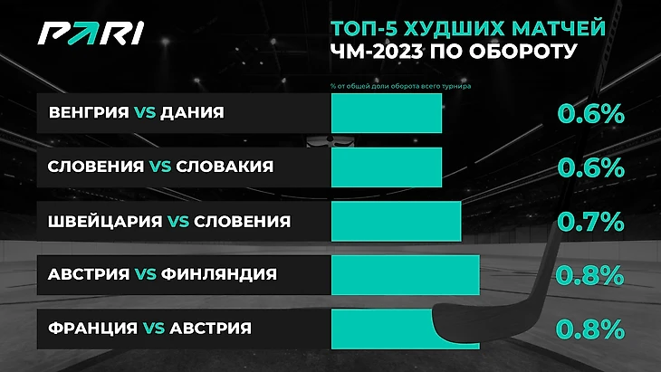 В топ-5 по обороту также вошли полуфинальные матчи Канада — Латвия (3,4%) и США — Германия (3%), а также четвертьфинальная встреча Швеции и Латвии (3%) и матч группового этапа Словакия — Канада (2,9%). Меньше всего игрокам были интересны поединки группового этапа Венгрия — Дания, Словения — Словакия и Швейцария — Словения.