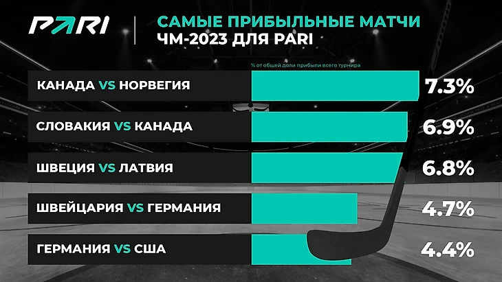 Любопытно, что самым прибыльным матчем ЧМ-2023 для PARI оказалась битва будущих чемпионов мира канадцев с норвежцами в рамках группового этапа. В этой игре в упорной борьбе сенсационно победила сборная Норвегии (3:2), хотя основное время матча завершилось ничьей. Норвежцы открыли счет, а затем удвоили преимущество, но канадцам удалось отыграться под занавес встречи. А в овертайме сильнее оказались европейцы. На этот матч пришлось 7,3% от всей прибыли, которую получила компания по ставкам на ЧМ-2023 по хоккею.