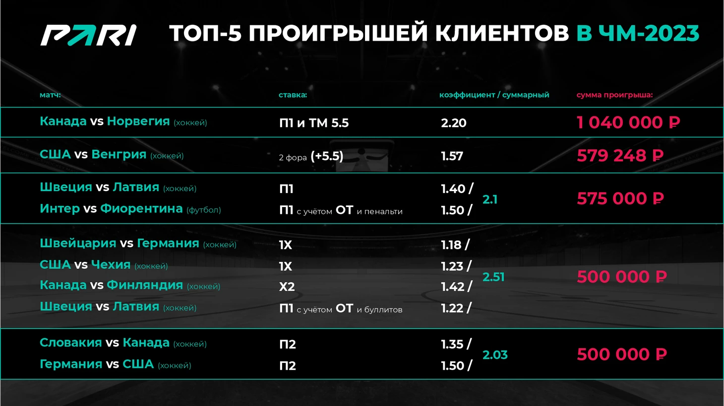 Букмекерская компания PARI подвела итоги чемпионата мира-2023 по хоккею, который проходил в Финляндии и Латвии и завершился 28 мая победой сборной Канады. Директор департамента устойчивого развития и интегрированных коммуникаций PARI Алексей Бабичев поделился информацией о самых прибыльных и убыточных для букмекерской компании и клиентов матчах хоккейного мундиаля.