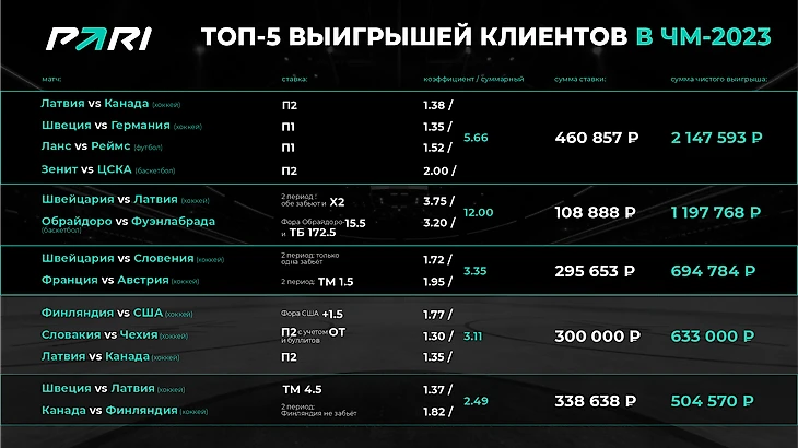 Если суммировать все матчи 16 участников турнира, то в целом все команды принесли PARI положительный результат. Но самой прибыльной сборной для PARI стала команда Латвии. Встречи с участием бордовых обеспечили около 14% прибыли компании суммарно по итогам турнира. В целом компания PARI по результатам приема ставок на ЧМ-2023 оказалась в существенном плюсе, зафиксировав высокие финансовые результаты.
