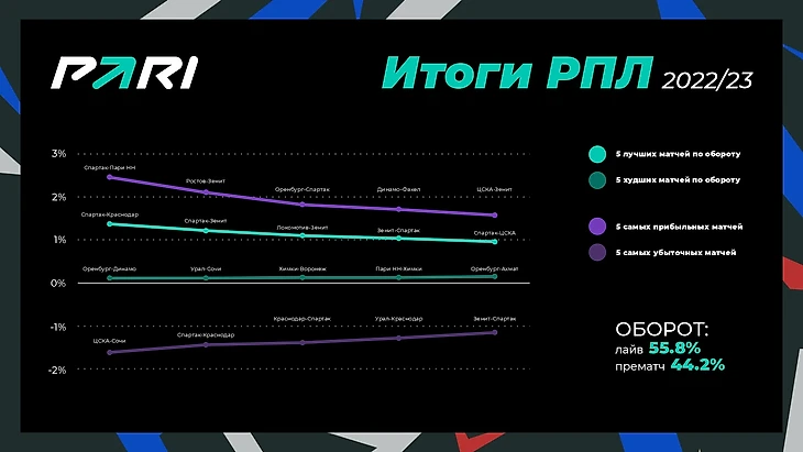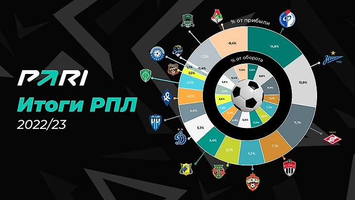 Букмекерская компания PARI подвела итоги Российской Премьер-лиги по футболу сезона 2022/23, в которой в пятый раз подряд победил «Зенит». Директор департамента устойчивого развития и интегрированных коммуникаций PARI Алексей Бабичев поделился информацией о самых прибыльных и убыточных для букмекерской компании и клиентов матчах одного из самых популярных футбольных турниров.