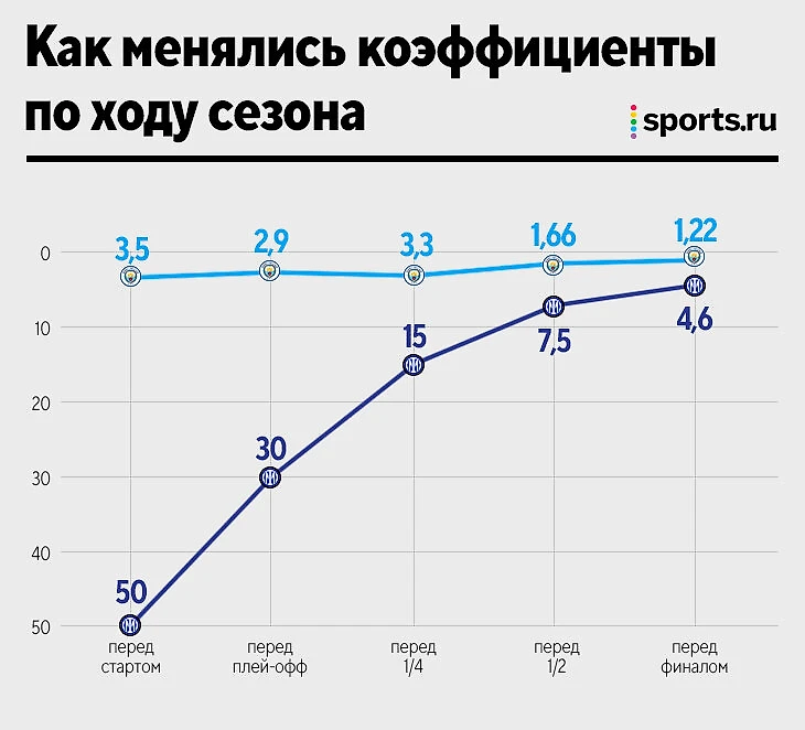 Настолько сильного дисбаланса перед финальным матчем крупного турнира в XXI веке (раньше – сложнее с данными) еще не было. Соотношение в пользу «Сити» похоже на то, что бывает в кубковых финалах, например, в Чехии («Баник» – «Спарта» Прага – 9,5 на 1,36) или Беларуси (БАТЭ – «Ислочь» – 1,35 на 7,2). Или когда до решающего матча Кубка английской лиги доходит «Кардифф», а там «Ливерпуль» – так было в 2012-м, на валлийцев давали 5,00, близко к нынешнему «Интеру». Правда, тогда ливерпульцы выиграли трофей только в серии пенальти, а не с форой -2,5, как предполагалось.
