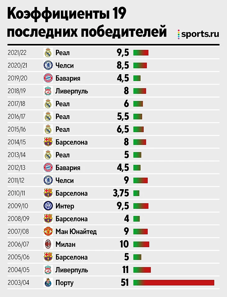 Не берем в расчет разницу коэффициентов, просто смотрим, у кого был выше перед решающим матчем. Два предыдущих финала забирал тот, в кого меньше верили: «Реал» у «Ливерпуля» (за 2,5) и «Челси» у «Манчестер Сити» (за 3,1). До этого восемь раз подряд выигрывали фавориты.