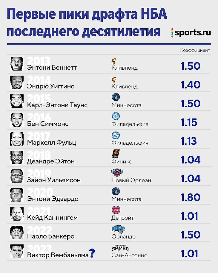 • В 2013, 2015 и 2022 годах кэф был в районе 1.50 – забирали, как казалось, самых готовых к НБА игроков (а мы уже помним по вечным текстам Рахона, что это значит).