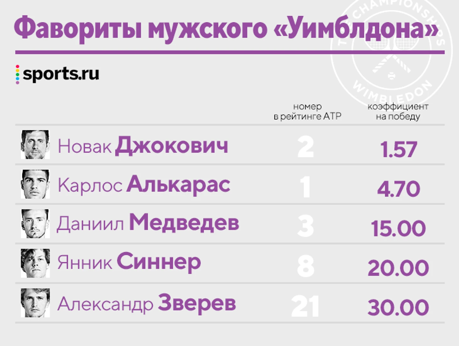 Джок выглядит предпочтительнее по одной простой причине – серб выиграл оба «Больших шлема» в этом сезоне, а в Лондоне не проигрывает с 2018 года. Интересным выглядит выбор Александра Зверева в топ-5 главных фаворитов этого «Уимблдона». Похоже, аналитиков БК зацепила его статистика на травяном покрытии в 2023 году, ну и в целом немец как будто возвращается на тот уровень, откуда выпал почти на год из-за травмы. Зверев только что выиграл 3 матча в Галле, правда, оступился на Бублике в полуфинале.
