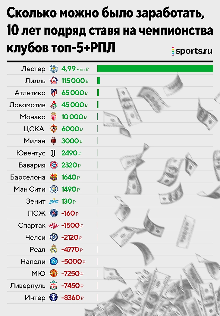 • Есть и другая тенденция: если постоянно ставить на доминирующую команду, много не заработаешь: что такое 2500 рублей за 10 лет? А можно заработать и смешные 130 рублей или вообще уйти в минус, как с «ПСЖ».