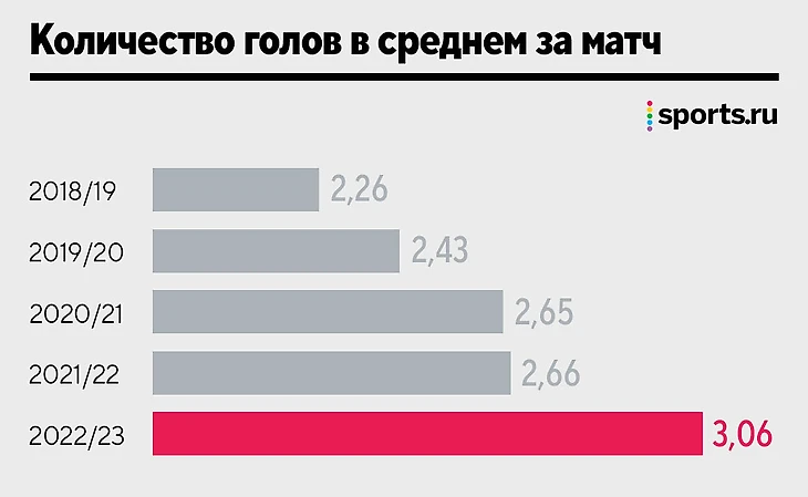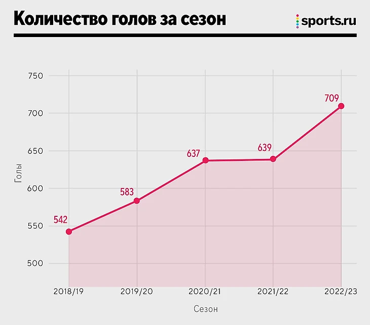 За последние пять лет средняя результативность матчей РПЛ росла, постепенно и медленно, но росла. А в сезоне-2022/23 прорвало: общее число голов за сезон перевалило 700.